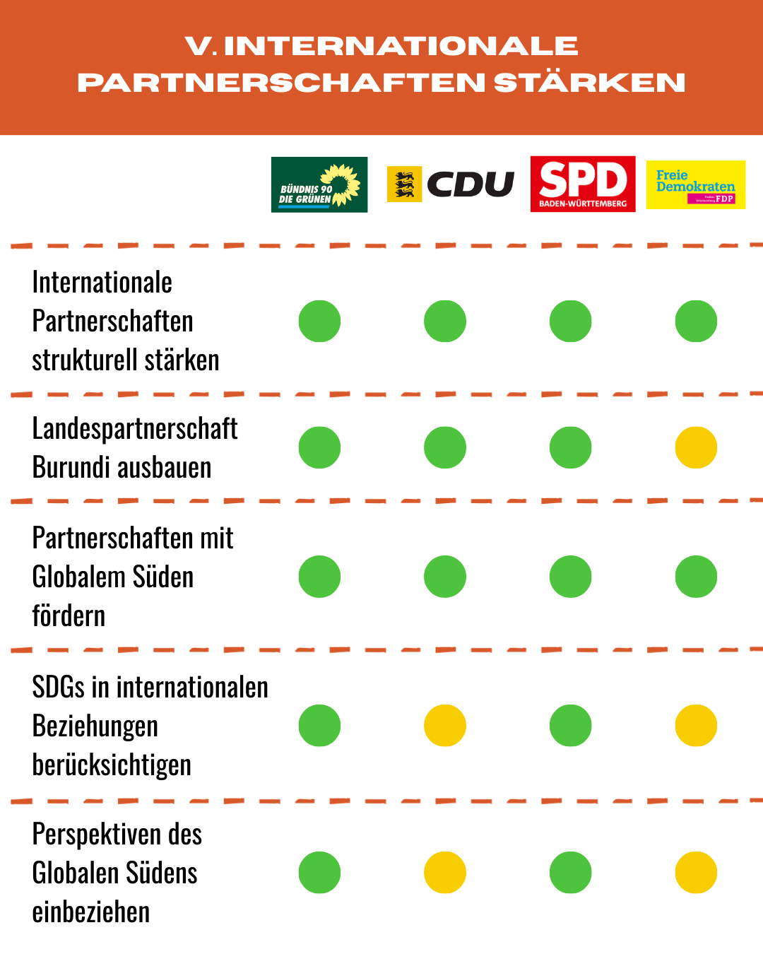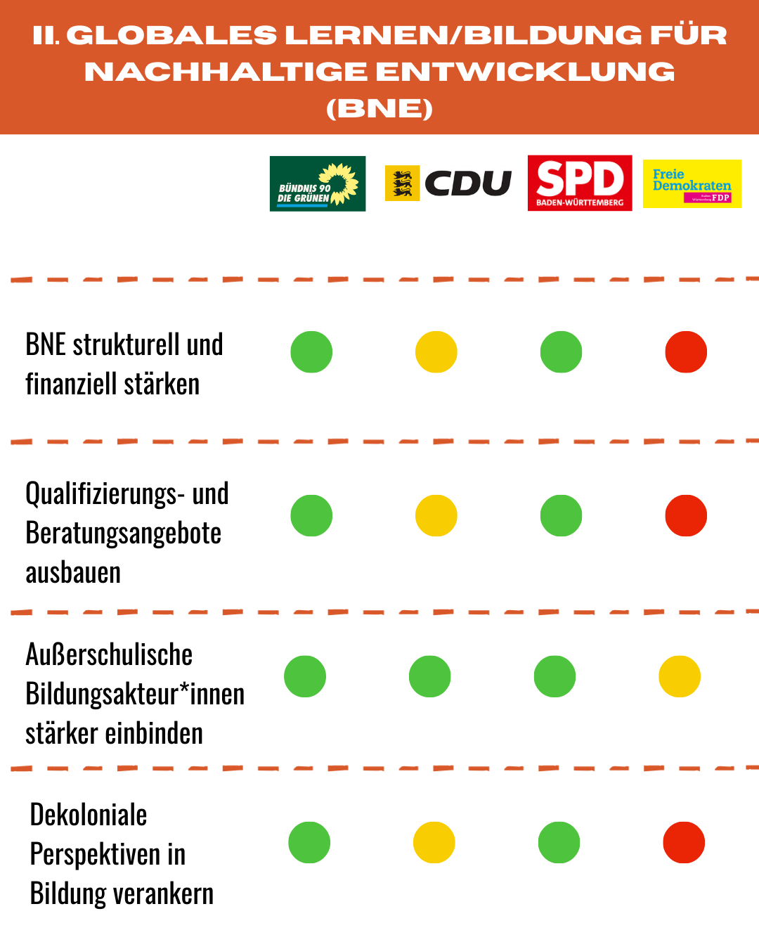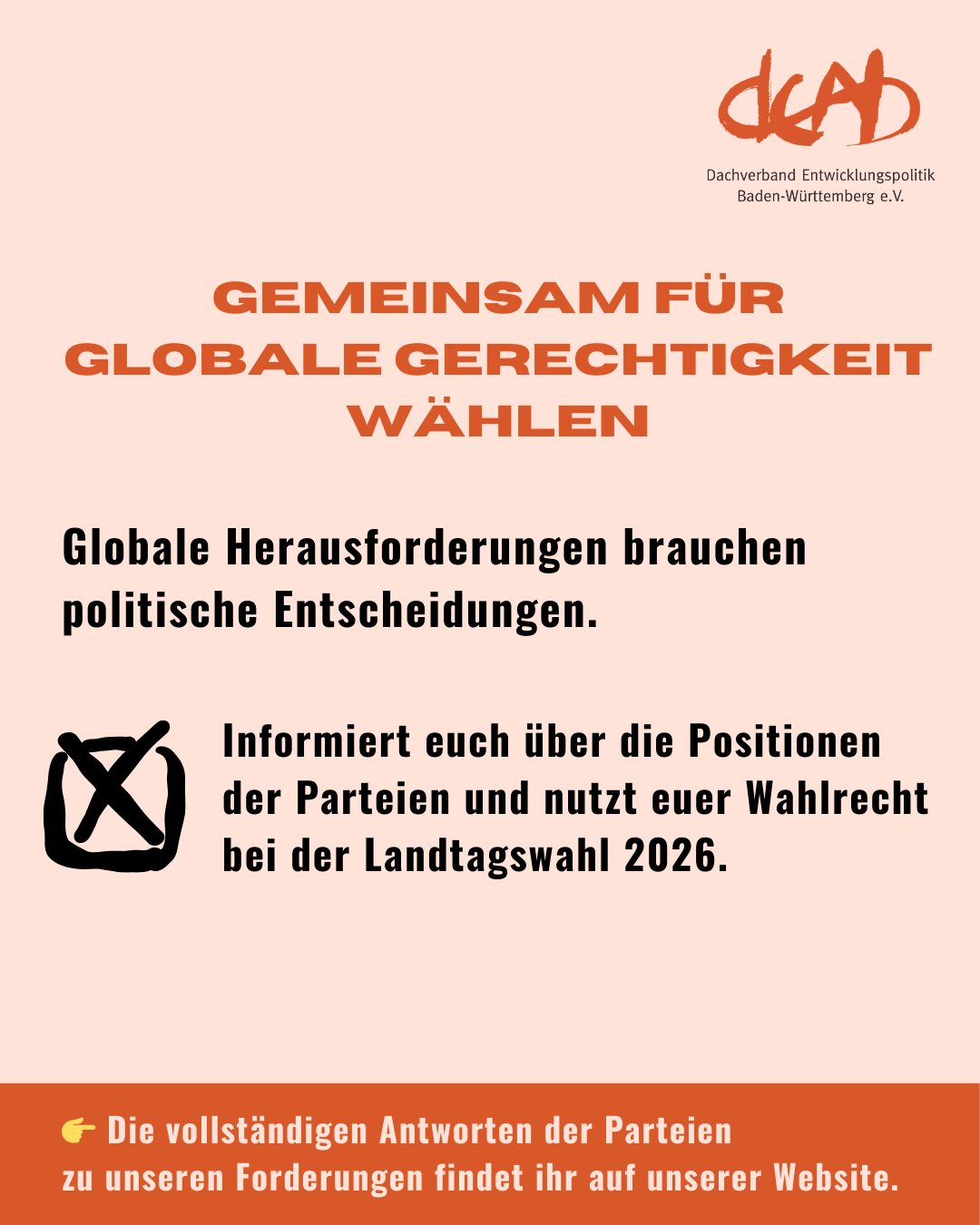 Im Vorfeld der Landtagswahl 2026 haben wir auf dieser Grundlage Parteien zu ihren Positionen zu zentralen entwicklungspolitischen Themen befragt. Ausgewertet wurde, wie sich die Parteien zu Globalem Lernen, Klimagerechtigkeit, internationaler Partnerschaftsarbeit und der Förderung der Zivilgesellschaft positionieren. Die Ergebnisse finden Sie in unserem Wahlprüfsteincheck. Zudem nachfolgend die vollständigen Antworten auf unsere Wahlprüfsteine nach Partei: CDU, FDP, Grüne, SDP.