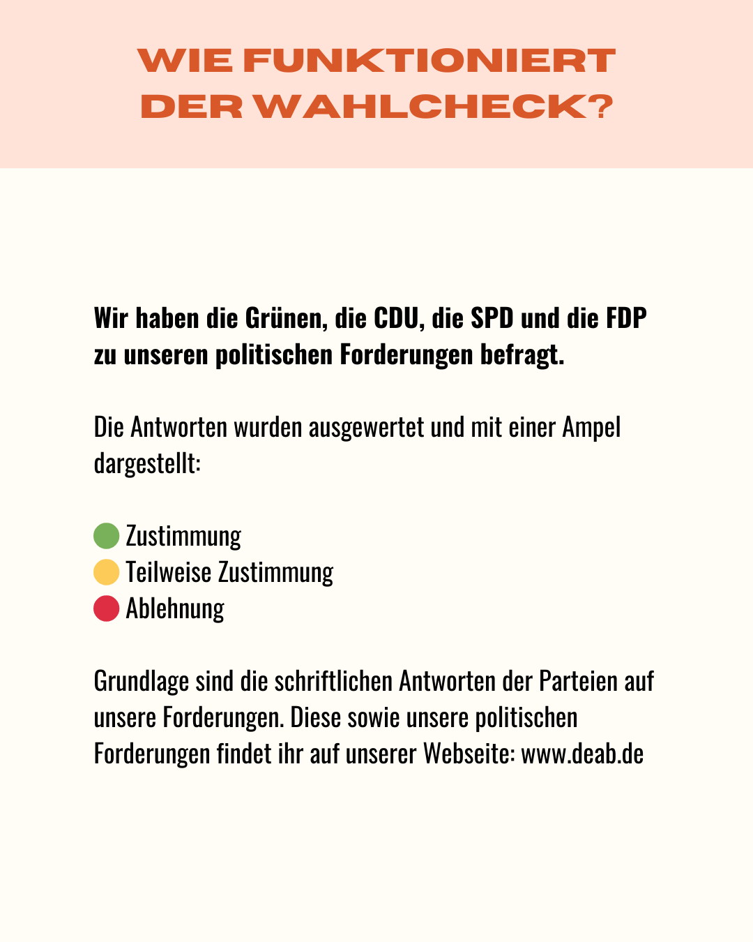 Eine Arbeitsgruppe mit Mitgliedern des DEAB-Vorstandes, Mitarbeiter*innen der DEAB-Geschäftsstelle und Vertreter*innen aus Mitgliedsorganisationen – die AG Landespolitik – trifft sich regelmäßig, um gemeinsam über landespolitische Anliegen zu beraten und Strategien für die Umsetzung zu entwickeln. Wer daran interessiert ist, in dieser AG mitzuarbeiten, möge sich bitte an die Geschäftsstelle wenden.